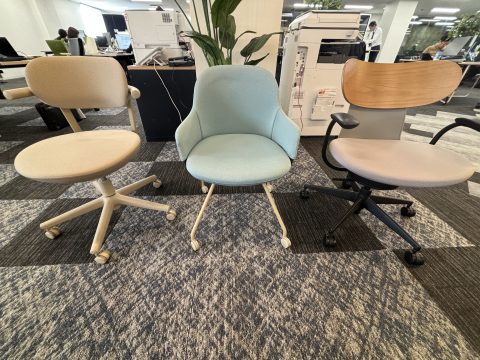 イスも、テーブルごとに変えています。メッシュタイプやクッションタイプ、座が高いものや低いもの、それぞれ用意しています。社員はその時の気分で選ぶことができるので、快適に仕事に集中することができます。