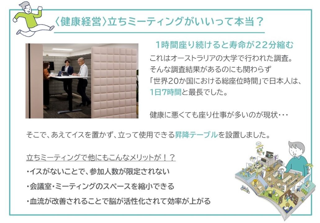 半個室ブースのフォーレには「立ちミーティング」ができる場を設けています。短時間で効率よく会議をするという目的もありますが、それだけでなく健康経営の観点でも良いとされているのです。