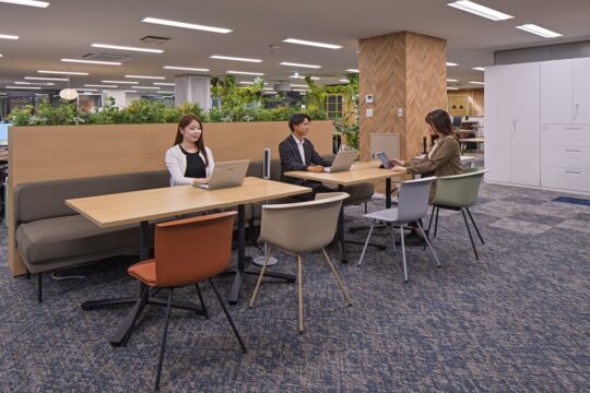 集中とコミュニケーションの両立ができるラウンジエリアには、テーブルと一体型になったフェイクグリーンを取り入れています。中央にグリーンがあることで、視線をほどよく遮り、集中しやすい環境をつくります。一方で、周囲の様子を感じとれるため、話しかけやすい雰囲気も生まれます。