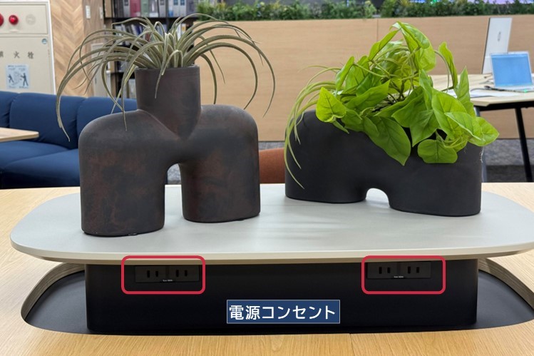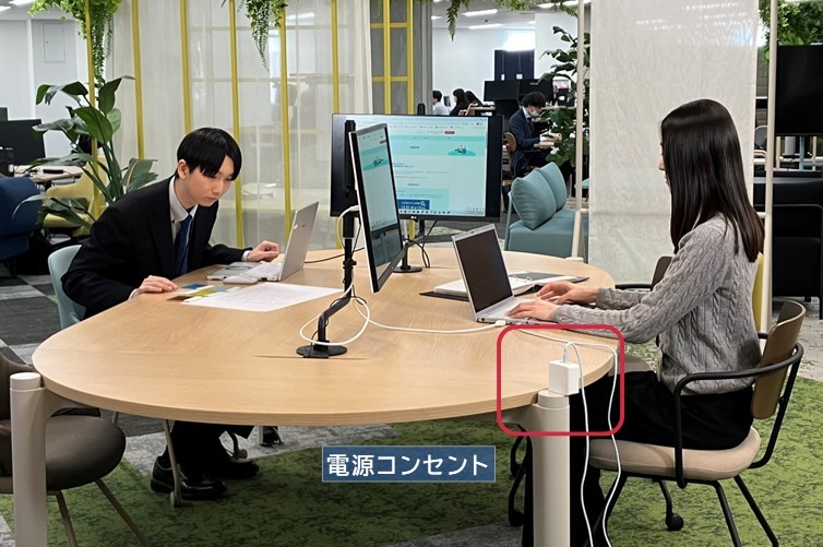 電源は脚部についているため、作業スペースを広く確保できます。資料を広げながらの作業や打ち合わせもしやすく、集中とコミュニケーションの両立を実現します。