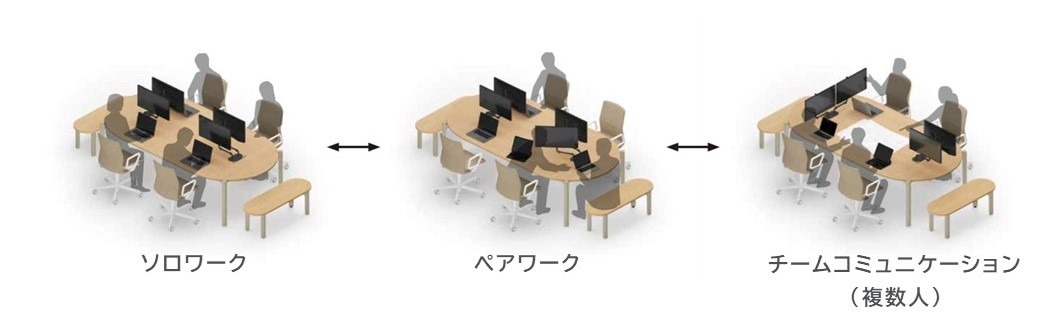 モニターの位置を自在に動かせるため、ソロワークだけでなく、横並びで画面を共有しながらのペアワークや、全員で画面を見ながらのミーティングなど、円滑な情報共有が可能です。