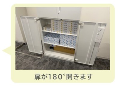 両開きタイプと比べて、通路方向のスペースを約40㎝削減できるため、通路幅が限られている場所でも設置しやすくなります。一方で、扉が左右どちらかに残るため、収納物を全面的に一覧することはできません。