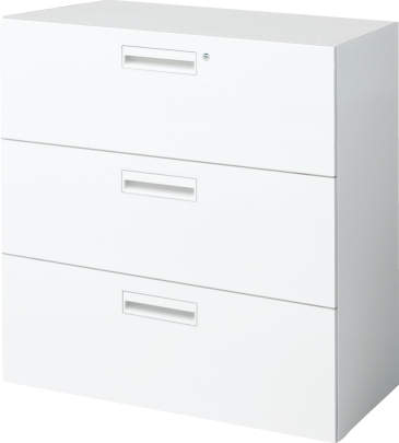 上から見下ろす形で一覧できるため、書類やファイルだけでなく、細かな備品の収納にも適しています。一方で、引き出しを手前に引き出す分、両開き扉と同様に、一定のスペースが必要です。