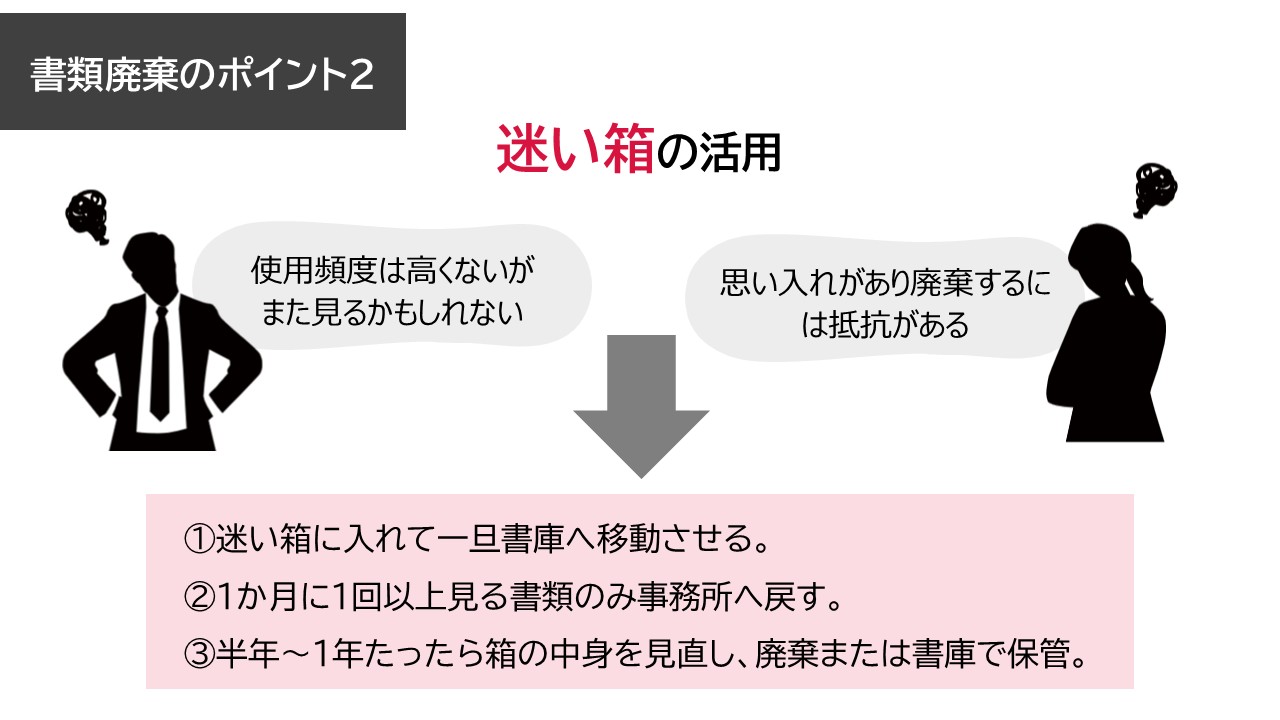 迷い箱とは、「もしかしたら見るかもしれない」「思い入れがあってすぐに廃棄できない」といった書類を一時的に保管する箱のことです。