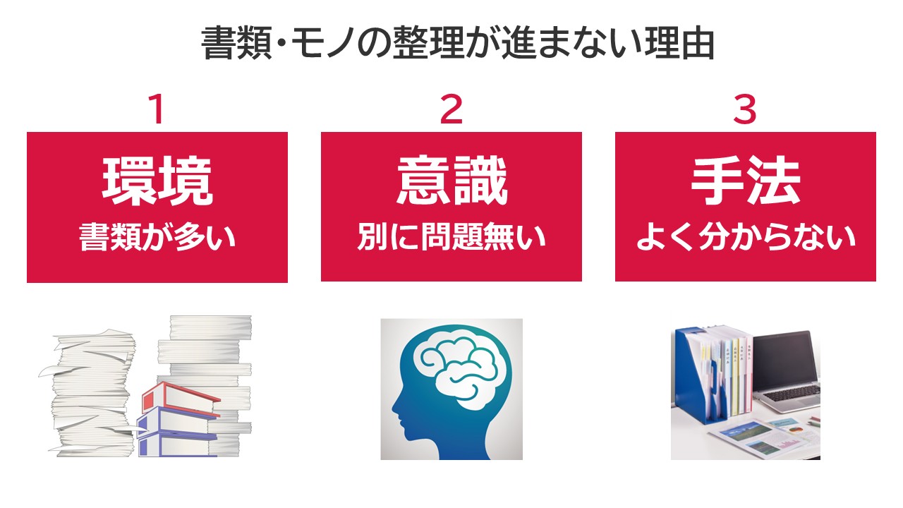 整理が進まない主な原因は、「環境」「意識」「手法」の3つに分けられます。