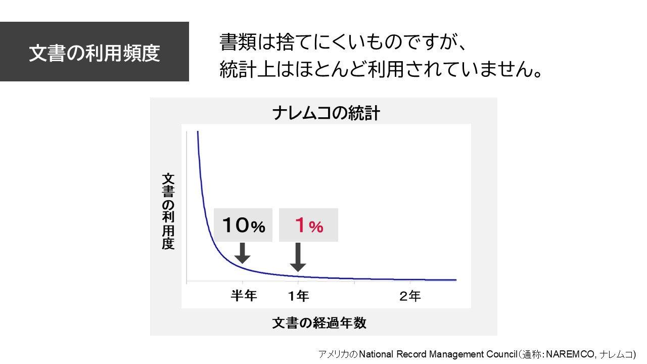 しかし、ナレムコの統計によると、作成・収集した文書のうち、半年経過した書類の利用率は10%、1年経過するとわずか1%だと言われています。