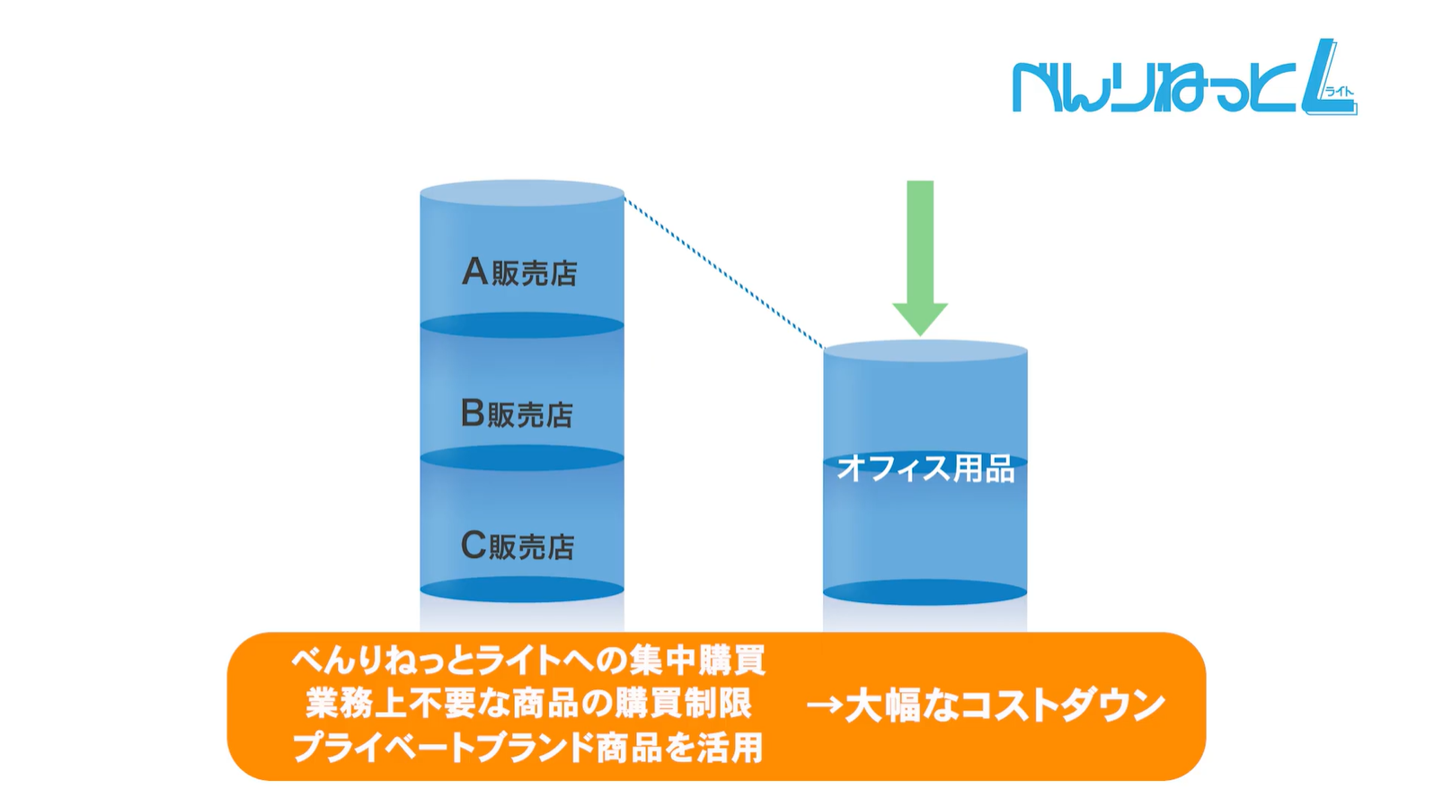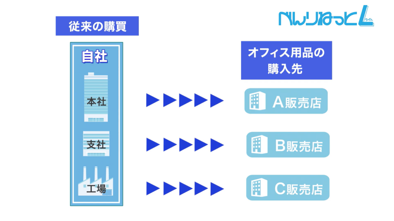 本社・支社・工場がそれぞれ別の取引先から購買していたオフィス用品の購入先を、べんりねっとライトに集約。