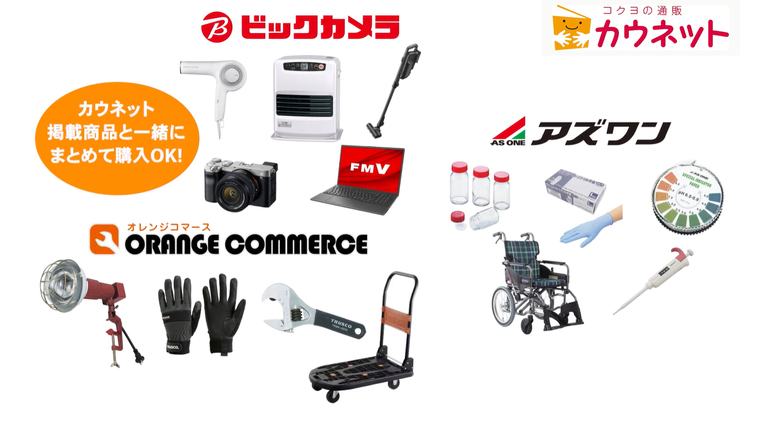カウネット掲載商品と一緒に、ビックカメラ、オレンジコマース、アズワンなど専門店の商品もまとめて購入できます。