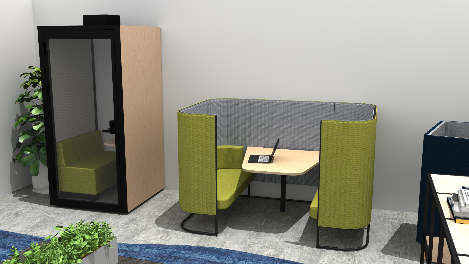 通常デスクの他に、ソファー席やボックス席、ソロブースなどを用意。