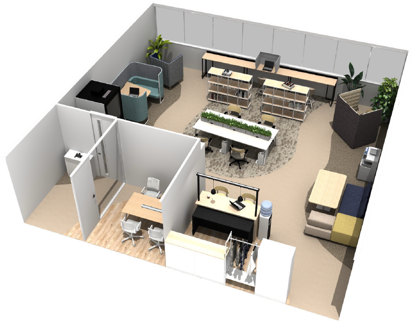 ① テーマに沿ったレイアウト案とエリアごとの特徴をご紹介!② オフィスのカラーや目的に合わせたオフィス家具のイメージがわかる!③ 座席数や面積などオフィスデータが見られる!