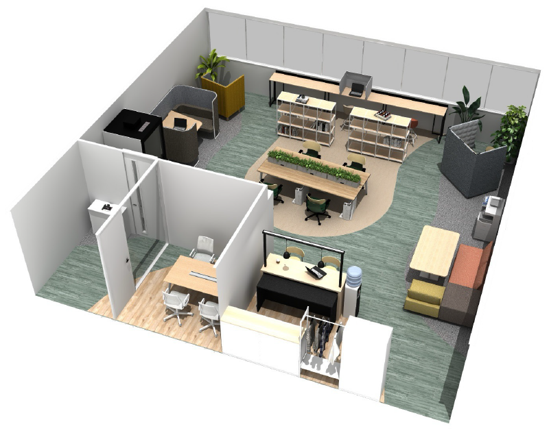 ① テーマに沿ったレイアウト案とエリアごとの特徴をご紹介!② オフィスのカラーや目的に合わせたオフィス家具のイメージがわかる!③ 座席数や面積などオフィスデータが見られる!