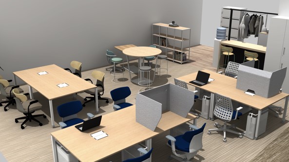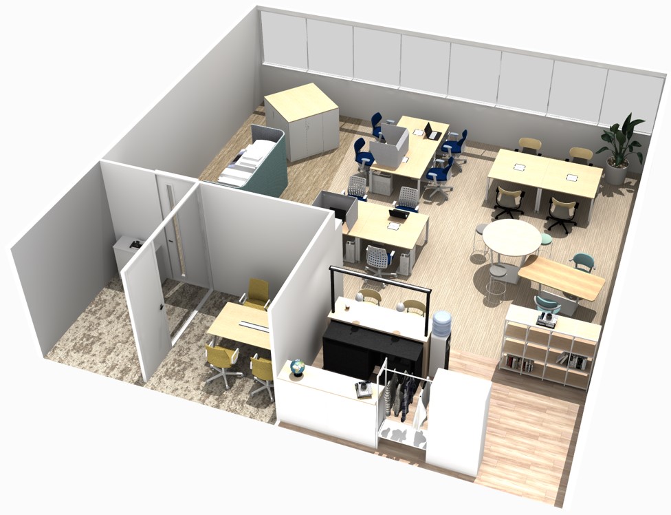 ① テーマに沿ったレイアウト案とエリアごとの特徴をご紹介!② オフィスのカラーや目的に合わせたオフィス家具のイメージがわかる!③ 座席数や面積などオフィスデータが見られる!