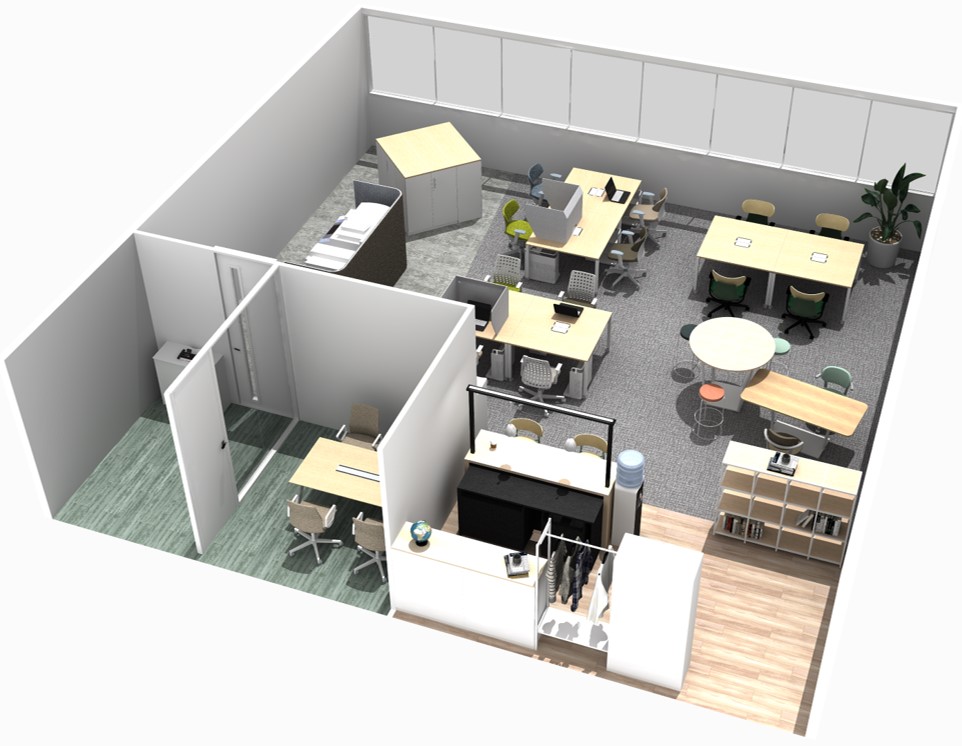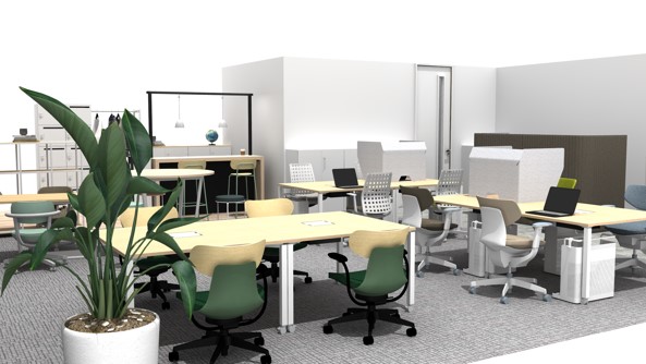 ① テーマに沿ったレイアウト案とエリアごとの特徴をご紹介!② オフィスのカラーや目的に合わせたオフィス家具のイメージがわかる!③ 座席数や面積などオフィスデータが見られる!