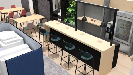 | オフィスの特徴 | 交互に並べることで視線が気になりにくい4人席のデスクと、パソコンや書類を収納する個人ロッカーを用意。社員同士のコミュニケーションを促進するカフェカウンターは、外出の合間の一時的な業務などにも利用可能。 |