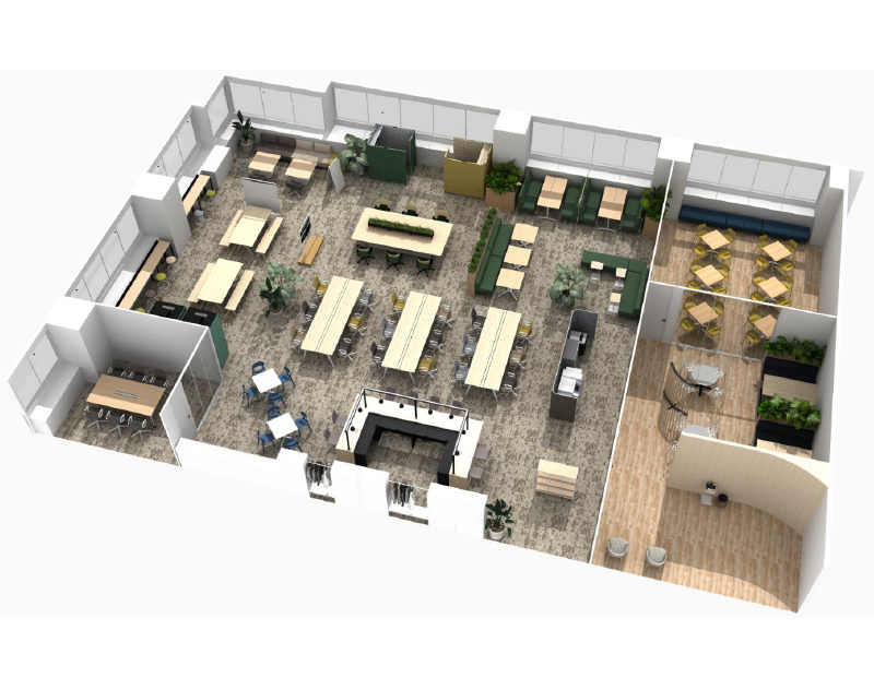 | オフィスの特徴 | 通常デスクの他に、ソファー席やボックス席、ソロブースなどを用意。コミュニケーションを促進するカフェカウンターは、一時的な業務にも。休憩・研修・打合せなど多目的に利用できるエリアも配置。その日の気分や仕事内容に合わせて席を選べるオフィス。 |