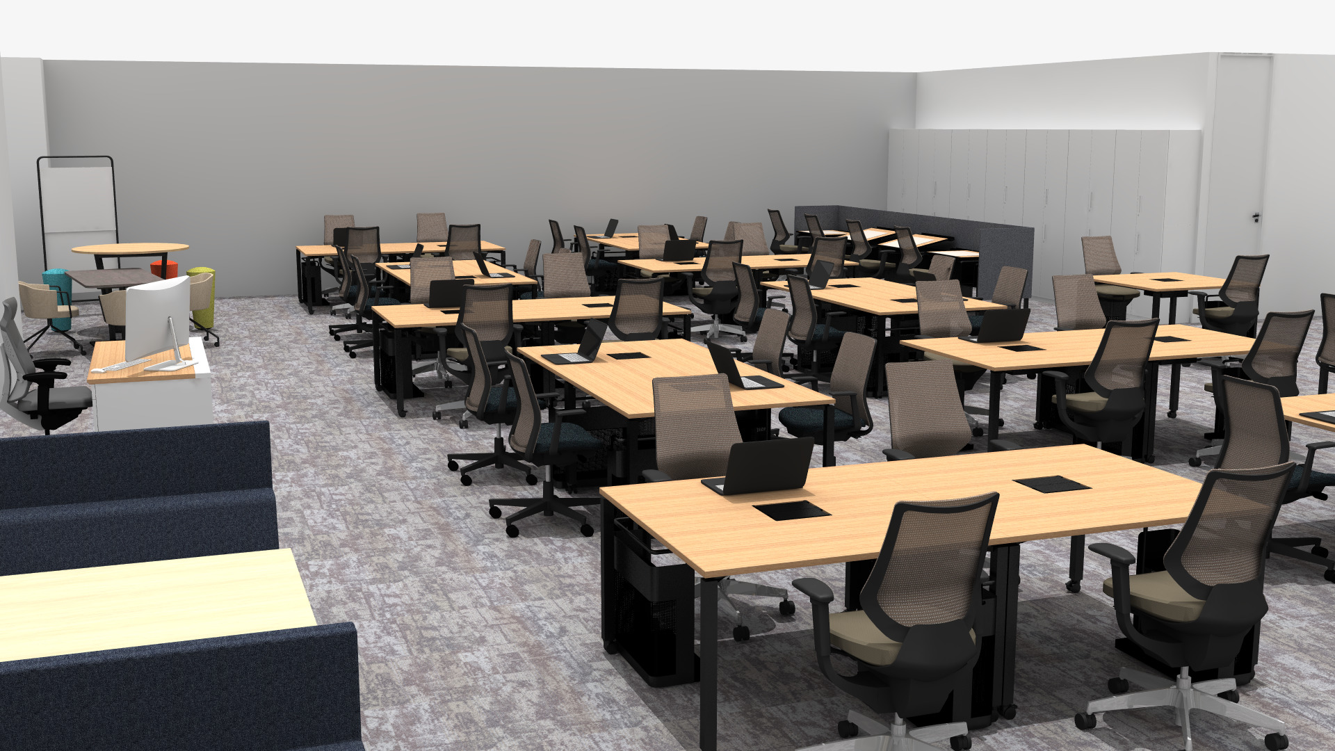 | オフィスの特徴 | 4人席・2人席のデスクのほか、集中できるソロブース、気軽に打合せのできるミーティングスペースなどを用意。社員それぞれのパソコンや書類は、壁面に配置した個人ロッカーに収納する。会議室はガラス間仕切りを採用し風通しの良い印象に。 |