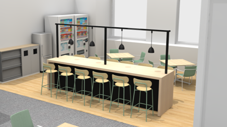 | オフィスの特徴 | 4人席を基本に、大人数にも対応可能なロングデスクや集中できるソロブース、気軽に使えるミーティングスペースなどを用意。社員それぞれのパソコンや書類は、個人ロッカーに収納する。休憩スペースにはコミュニケーションを促進するカフェカウンターを配置。 |