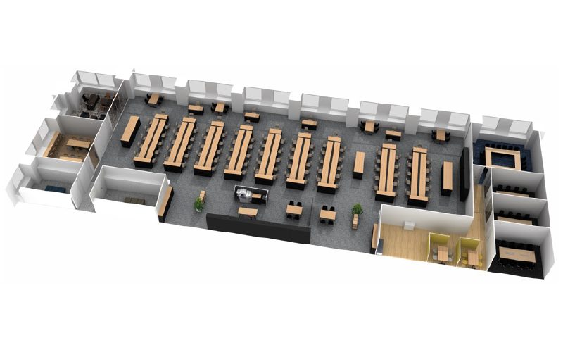 | オフィスの特徴 | 社員それぞれの固定席のほか、気軽に使えるミーティングスペースを用意。複合機や作業スペースを1カ所にまとめ省スペースに貢献しつつ、社員が偶発的に出会いコミュニケーションを取る場にも。役員室はガラス間仕切りを採用し風通しに良い印象に。 |
